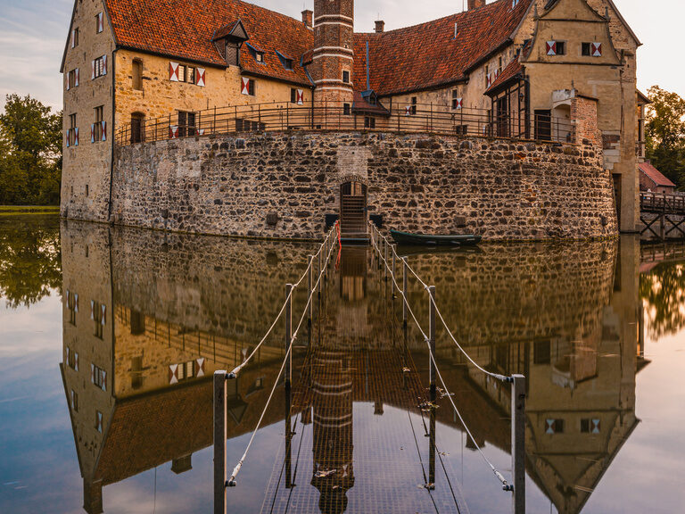 Die drei Burgen – Burg Vischering, Burg Lüdinghausen und Burg Wolfsberg - liegen nur ein paar hundert Meter auseinander und lassen sich bequem im Rahmen eines kleinen Spaziergangs besuchen. Besonders die Burg Vischering ist einen Besuch wert; von hier aus empfehlen wir, zu Fuß in den Ortskern zu laufen - die Strecke führt vorbei an wunderschönen Gärten. Im Café Indigo werden Sie nicht nur mit hausgemachten Kuchen verwöhnt, im direkt angeschlossenen Shop finden Sie den Werkstattladen von Frau Schlüter, die Ihnen gern die Münsterländer Blaudruckkunst zeigt.