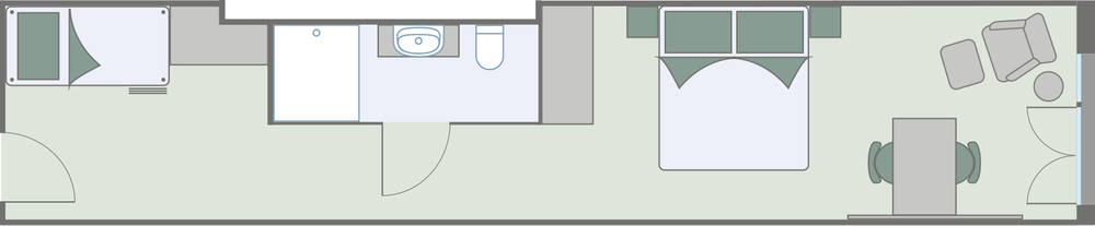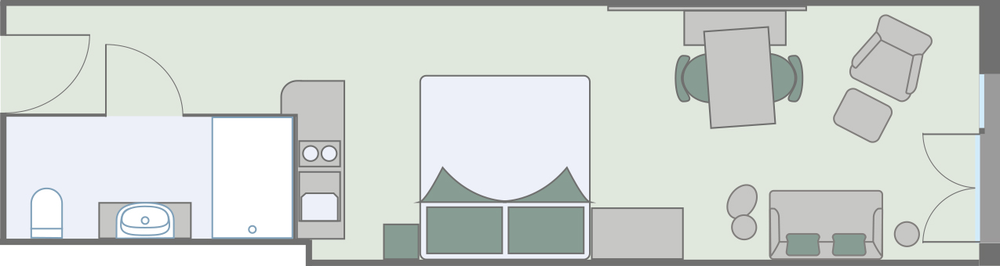 Auf 60 qm bieten sie eine Küchenzeile, einen Wohn- und Schlafbereich und einen Esstisch für 4 Personen. Weiterhin sind sie mit einer ausziehbaren Schlafcouch ausgestattet. Highlight ist die eigene kleine Sauna im Zimmer und auch das Badezimmer bietet mit einer ebenerdige Dusche, Fußbodenheizung sowie Handtuchwärmer jeden Komfort. In den Studios ist WLAN, eine Klimaanlage und Internet-TV vorhanden.