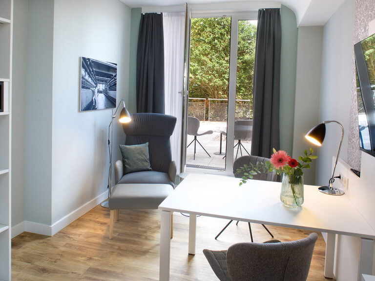 Sie sind freundlich und hochwertig inklusive kleiner Küchenzeile mit Backofen und Kühlschrank eingerichtet. Die geräumigen Zimmer verfügen zusätzlich über einen Ess- und Schreibtisch sowie eine gemütliche Sitzgelegenheit. WLAN, Klimaanlage und Internet-TV sind vorhanden.