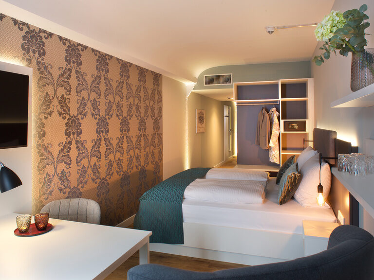 Neben einem 2,00m x 1,80m großen Doppelbett verfügen sie über einen kleinen Schreibtisch, eine Sitzgelegenheit, WLAN, Klimaanlage und Internet-TV. Im Badezimmer erwartet Sie eine ebenerdige Dusche, ein Handtuchwärmer und ausreichend Platz mit vielen Ablagemöglichkeiten.
