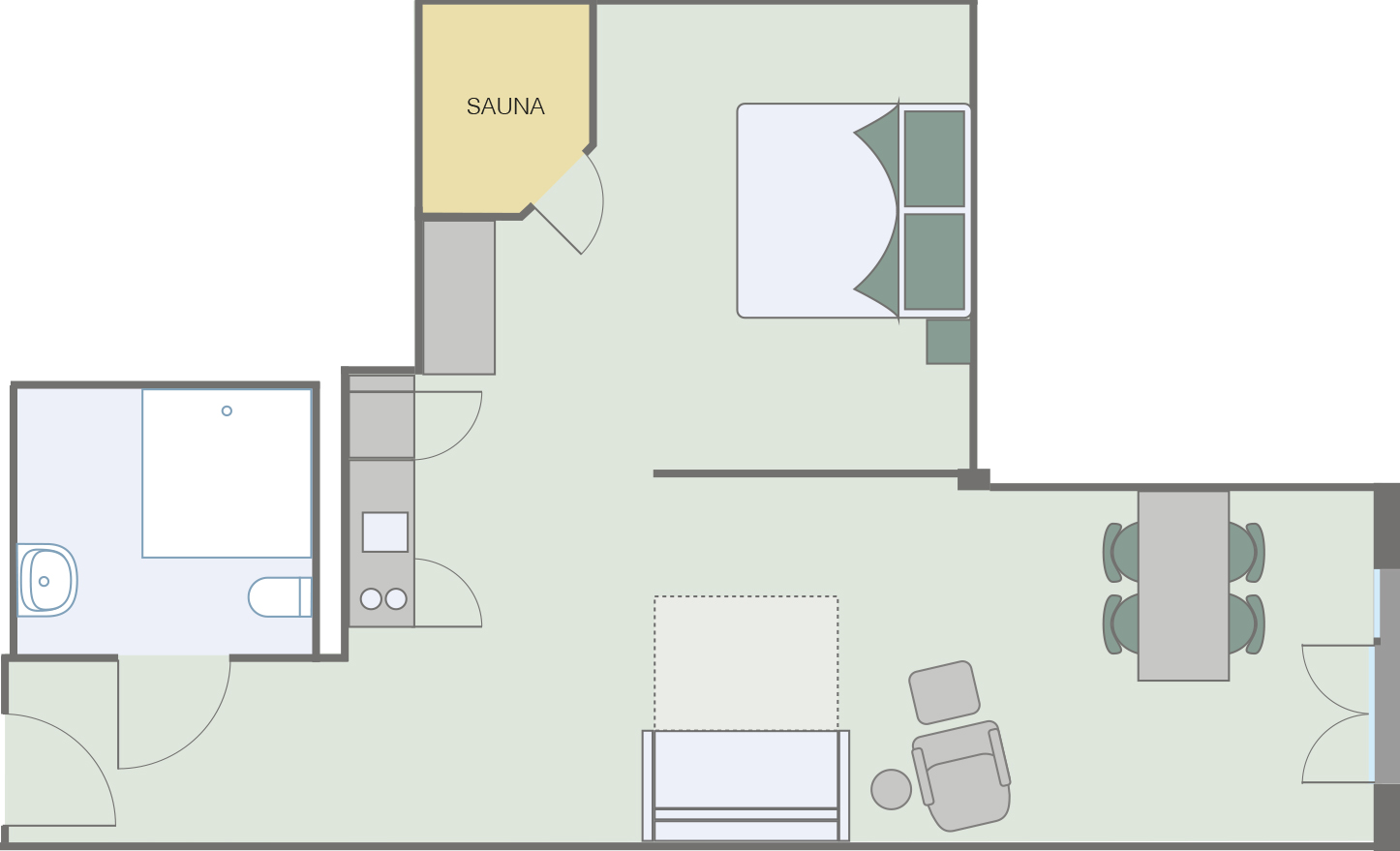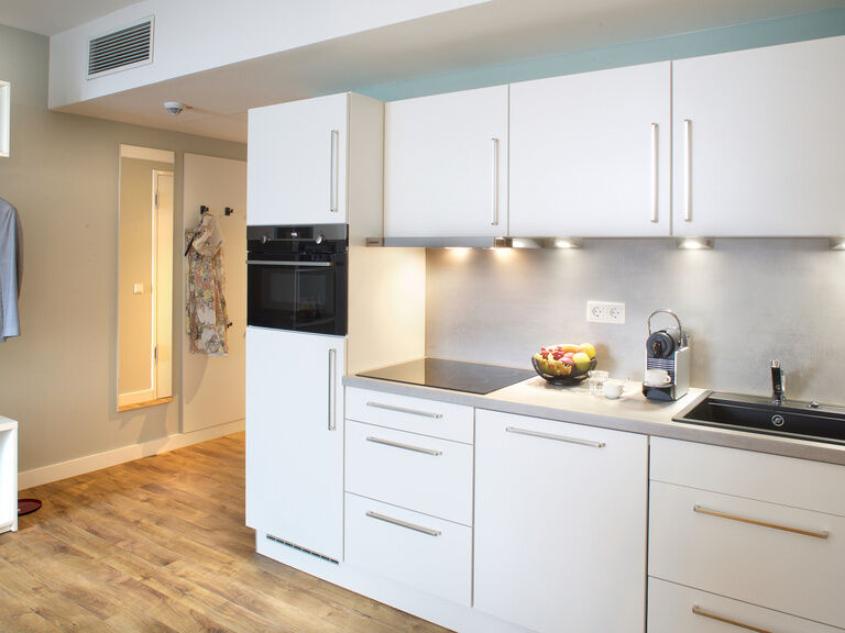 Auf 60 qm bieten sie eine Küchenzeile, einen Wohn- und Schlafbereich und einen Esstisch für 4 Personen. Weiterhin sind sie mit einer ausziehbaren Schlafcouch ausgestattet. Highlight ist die eigene kleine Sauna im Zimmer und auch das Badezimmer bietet mit einer ebenerdige Dusche, Fußbodenheizung sowie Handtuchwärmer jeden Komfort. In den Studios ist WLAN, eine Klimaanlage und Internet-TV vorhanden.